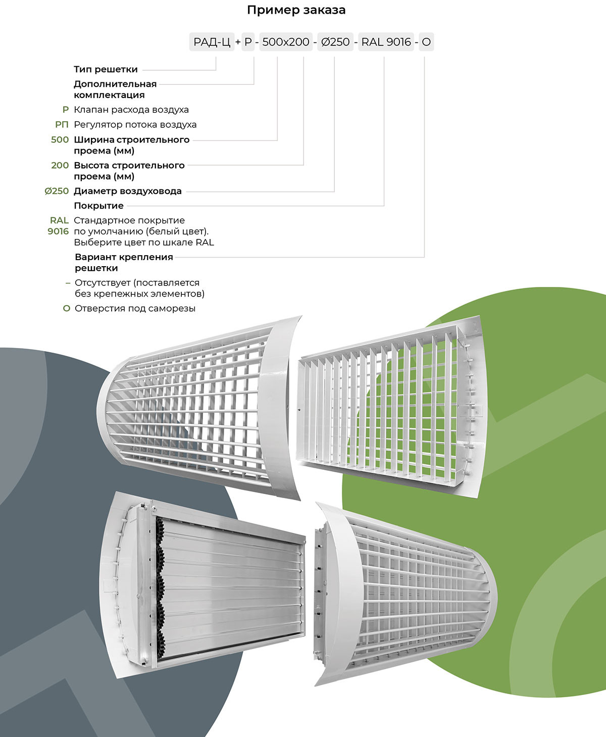 КРВ представляет собой рамку с установленными в неё лопатками. Положение лопаток регулируется при помощи ручки. Изменение положения лопаток позволяет изменять площадь свободного сечения решетки, тем самым регулируя объем подаваемого воздуха. Заказать двухрядную цилиндрическую решетку РАД-Ц+Р.